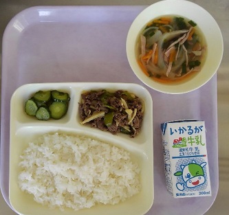 ごはん 牛乳 チンジャオニューロウスー ハムと野菜の中華スープ きゅうりの辛みづけ