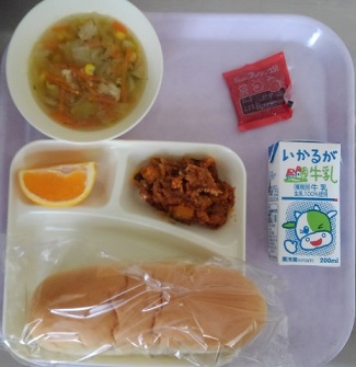 パン(基本配合) 牛乳 かぼちゃのミートグラタン スープ オレンジ いちごジャム