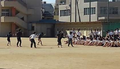 生徒のみんなの頑張りに「エール」を送るため、3年生の先生方が夜間に秘密練習をして、「模範演技」を見せてくれました。