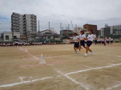 1年の学年競技は、台風の目です。三人一組で行います。