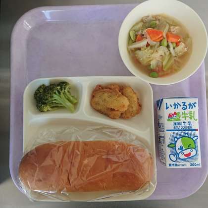 パン(基本配合以外) 牛乳 白身魚のフリッター スープ煮 ブロッコリーのサラダ