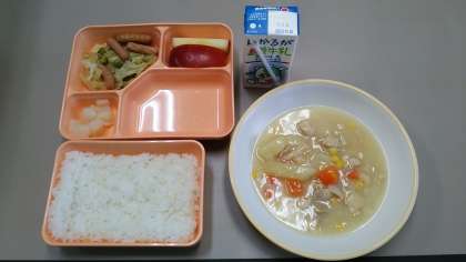 ウインナーと野菜のソテー、だいこんのピクルス、りんご、米飯、牛乳
