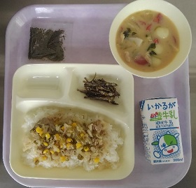 ごはん(減量) 牛乳 れんこんのちらしずし ぞう煮 ごまめ