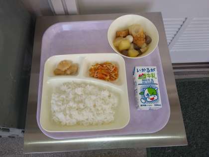 ごはん 牛乳 関東煮 もやしとにんじんの甘酢あえ 白花豆の煮もの