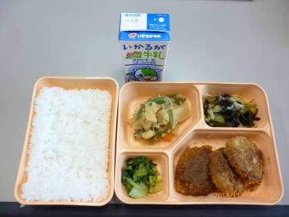 本日の給食のメニューは、みそかつ、赤平天とじゃがいもの煮もの、海そうサラダ、はくさいとほうれん草のおひたし、米飯、牛乳