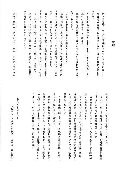 令和2年度 入学式に際しまして、PTA会長より祝辞をいただきました。