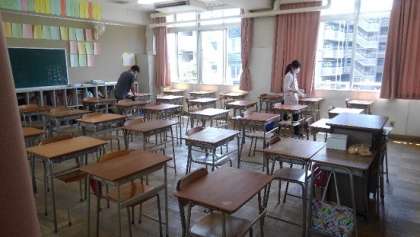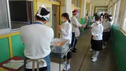 今は、午前、午後の2部制ですが、昼の短い入れ替え時間に先生たちで毎回教室などの消毒を行っています。給食も、今は先生が配っています。今日から、未開封のパンは持ち帰りができるようになりましたが、お家で必ず食べてください。お願いします。