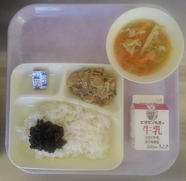 ごはん 牛乳 豚肉のごまみそ焼き すまし汁 のりのつくだ煮 固形チーズ