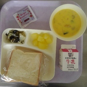 食パン 牛乳 かぼちゃのクリームシチュー ミックス海そうのサラダ りんご ジャム