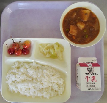 ハヤシライス 牛乳 キャベツのゆずドレッシング さくらんぼ