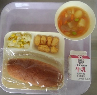 パン 牛乳 いかのてんぷら フレッシュトマトのスープ サワーソテー
