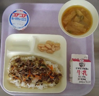 ごはん 牛乳 牛丼 とうがんのみそ汁 大福豆の煮もの ヨーグルト(中)
