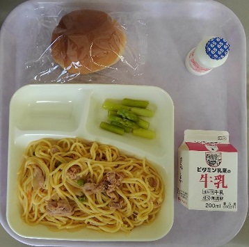 パン(1/2) 牛乳 ポークトマトスパゲッティ グリーンアスパラガスのサラダ 発酵乳