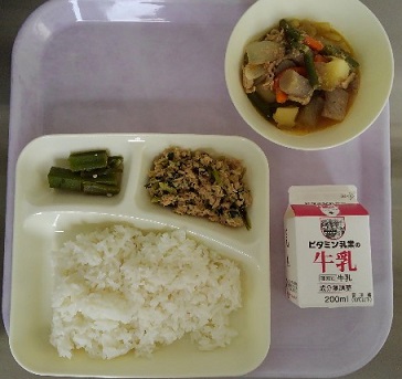 ごはん 牛乳 豚肉とじゃがいもの煮もの オクラの梅風味 ツナっ葉いため