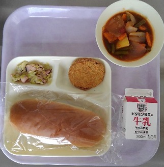 パン 牛乳 チキンレバーカツ ケチャップ煮 たことキャベツのバジルソテー
