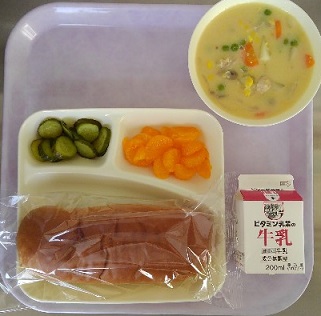 パン 牛乳 コーンクリームシチュー きゅうりのバジル風味サラダ みかん(缶)