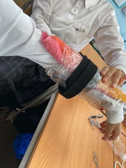 また、身近なものを使っての応急手当を実際に体験することもできました。