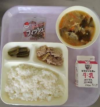 ごはん 牛乳 豚肉の甘辛焼き みそ汁 オクラのおかかいため アーモンドフィッシュ(中)
