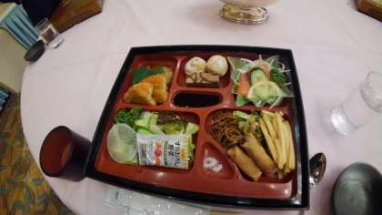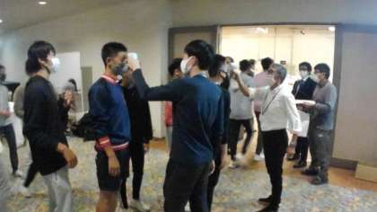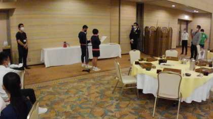入館式と夕食の様子です。密を避けるため、大広間に円形テーブル、各自の間隔を広く取っています。