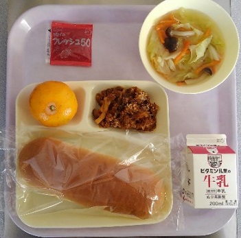 パン 牛乳 なすのミートグラタン 鶏肉と野菜のスープ みかん いちごジャム