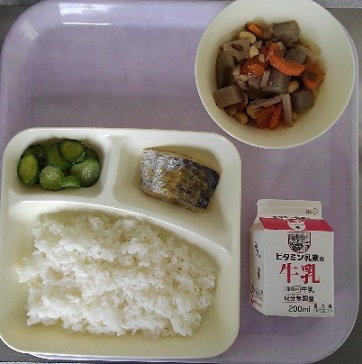 ごはん 牛乳 さごしのおろしじょうゆかけ 大豆と冬野菜の煮もの きゅうりのしょうがづけ