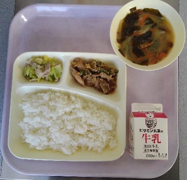 ごはん 牛乳 鶏肉のごまだれ焼き なめこのみそ汁 キャベツのいためもの