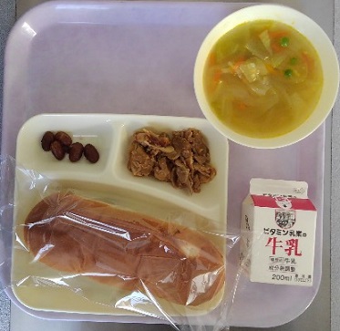 パン 牛乳 豚肉のデミグラスソース スープ うずら豆のグラッセ