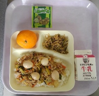 ごはん 牛乳 中華丼 もやしとさんどまめの中華あえ みかん まっ茶大豆(中)