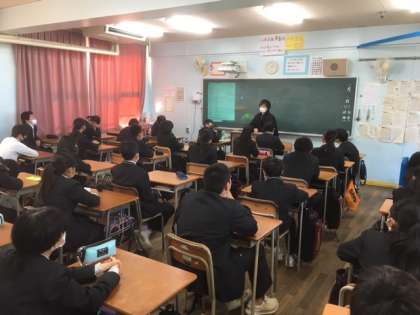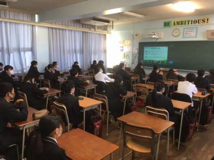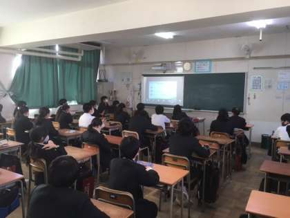 本日、五時間目に薬物乱用防止教室を行い、なんば少年サポートセンターの方にお話ししていただきました。