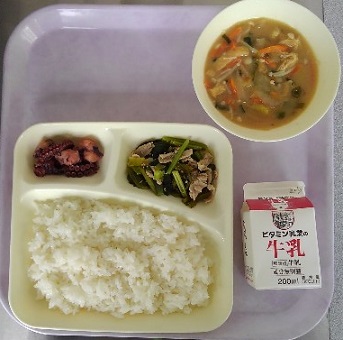 ごはん 牛乳 泉だこのやわらか煮 みそ汁 こまつなの煮びたし