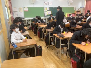 1年生は6時間目に送別式の取り組みとしてクラスで100羽の鶴を折りました。写真は1-4の様子です。