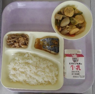 ごはん 牛乳 さごしのおろしじょうゆかけ 一口がんもとさといものみそ煮 れんこんのいためもの