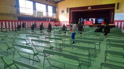 2年生は、体育館内の卒業式会場の設営が担当です。メジャーを使って椅子の間隔をそろえるなど、時間のかかる作業ですが、とても良い会場ができました。各学級委員と生徒会の皆さんは、紅白幕の設置まで手伝ってくれました。