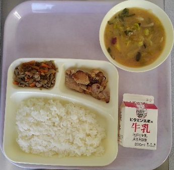 ごはん 牛乳 鶏肉のてり焼き さつまいものみそ汁 きんぴらごぼう