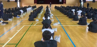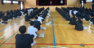 1年生は6時間目に体育館で学年集会をしました。今年はコロナウイルスのためなかなか学年で集まることができませんでしたが、今日は感染対策をした上で集まりました。