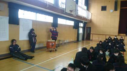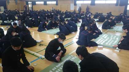 今日から1・2年生の学年末テストが始まりました。3年生では、午前中にふつう授業をしてから、午後に体育館で百人一首大会を行いました。