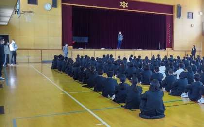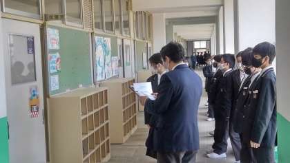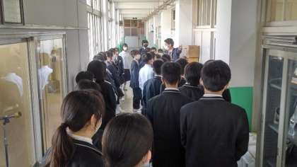 写真は2年生の学年集会と、1年生の校舎見学の様子です。