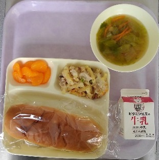 パン マカロニグラタン キャベツのスープ みかん(缶) 牛乳