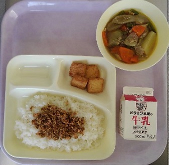 ごはん 牛乳 鶏肉とじゃがいもの煮もの あつあげのしょうゆだれかけ 紅ざけそぼろ