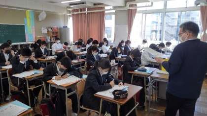 午前中に自宅でオンラインの学習を始めて、今日で3日目になりました。各教科が工夫をして、いろいろなやり方で学習を進めています。給食後の授業では、午前中のオンライン学習の振り返りを行っていますが、短時間にかなりの量を学ぶことになります。表情に、疲れが見える人もいました。先生たちも初めての取組みで、日々改良しようとしていますので、生徒の皆さんは頑張ってついてきてください。
