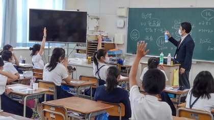 本日の出前授業は、三軒家東小学校で行いました。6年1組が数学科、6年2組が社会科、6年3組が理科の授業を行いました。さすが6年生、積極的に参加していました。