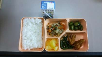 最初ののメニューは、鶏肉の竜田揚げ、三度豆のおひたし、豚肉と野菜の炒めもの、きゅうりのおかかあえ、りんご缶詰、米飯、牛乳