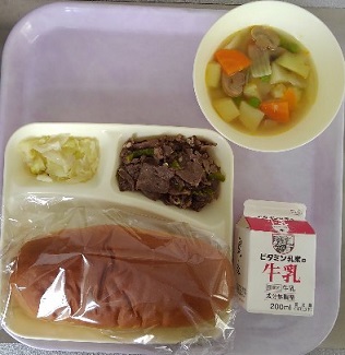 パン 牛乳 牛肉の香味焼き スープ煮 サワーキャベツ