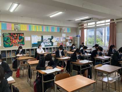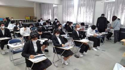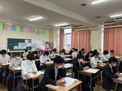 本日3年生は特別時間割を組み、各クラス3時間をかけて、リスニング、ライティング、リーディング、スピーキングの英語科の4技能の調査を行いました