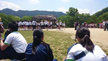 班ごとにポイントとコースを決めて、猿石や亀石、鬼の雪隠や俎、飛鳥資料館などを回り、甘樫丘と石舞台で班ごとに昼食をとりました。