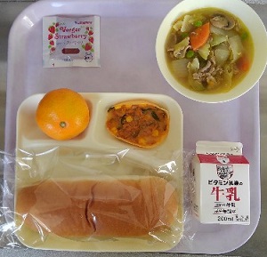 パン 牛乳 豚肉と野菜のスープ煮 変わりピザ みかん いちごジャム