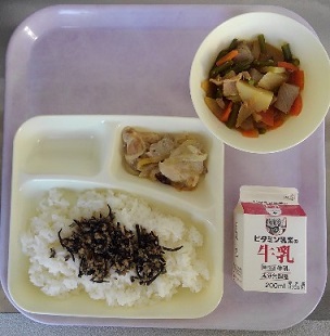 ごはん 牛乳 鶏肉のゆず塩焼き 含め煮 魚ひじきそぼろ
