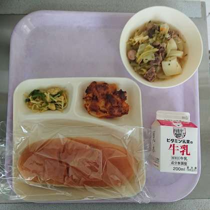 黒糖コッペパン 牛乳 ポトフ カレーソテー 桃のクラフティ