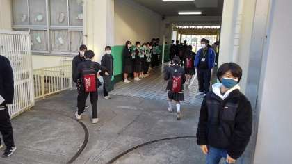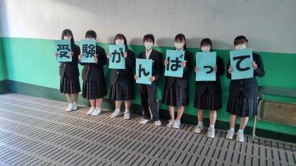 本日登校時間に生徒会代表による、明日受験のある3年生への激励の取組みがありました。例年であれば、声をからして『受験頑張ってください』との声掛けがあるのですが、今年度は感染防止の観点からメッセージプレートの掲示に替わりました。