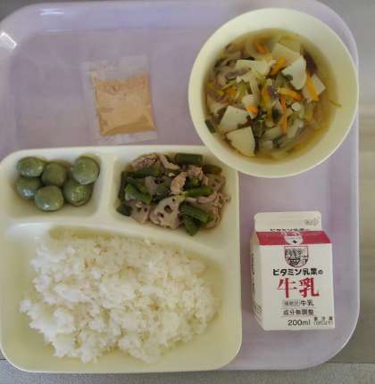 ごはん 牛乳 豚肉とれんこんのいため煮 五目汁 きな粉よもぎだんご